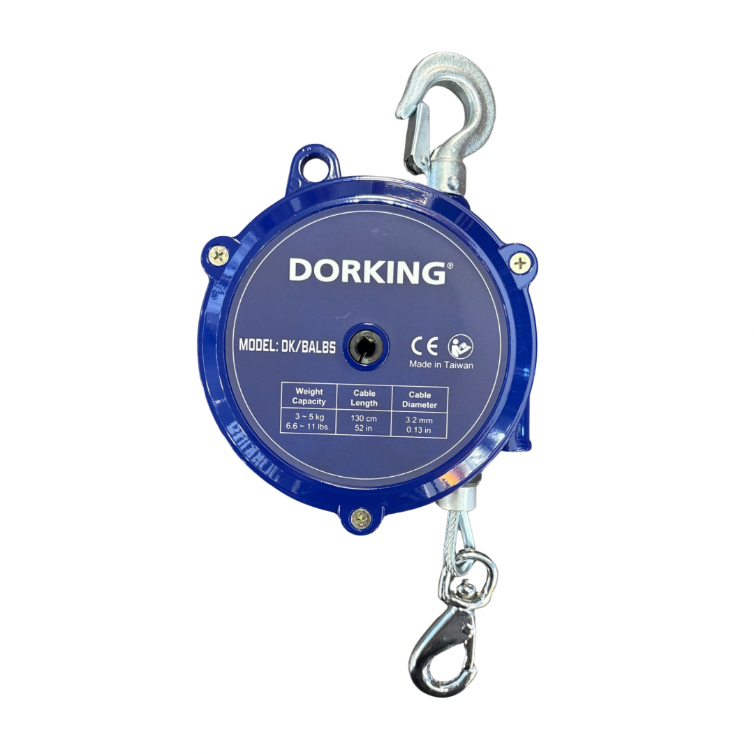 Balanceador industrial de alta durabilidad, fabricado con una estructura totalmente metálica para soportar entornos de producción intensiva. Presenta un mecanismo de seguridad fail-safe que previene la caída de la herramienta en caso de fallo del resorte, aumentando la seguridad operativa.